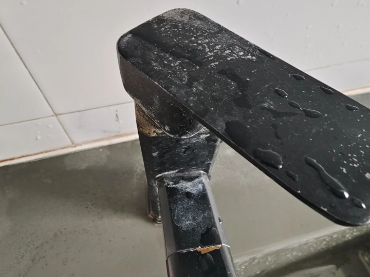 但黑色五金特别显水渍和水垢,每次用完龙头花洒,必须用干布擦干,否则时间久了会形成难以清理的水垢,黑色表面布满白花花的斑点。